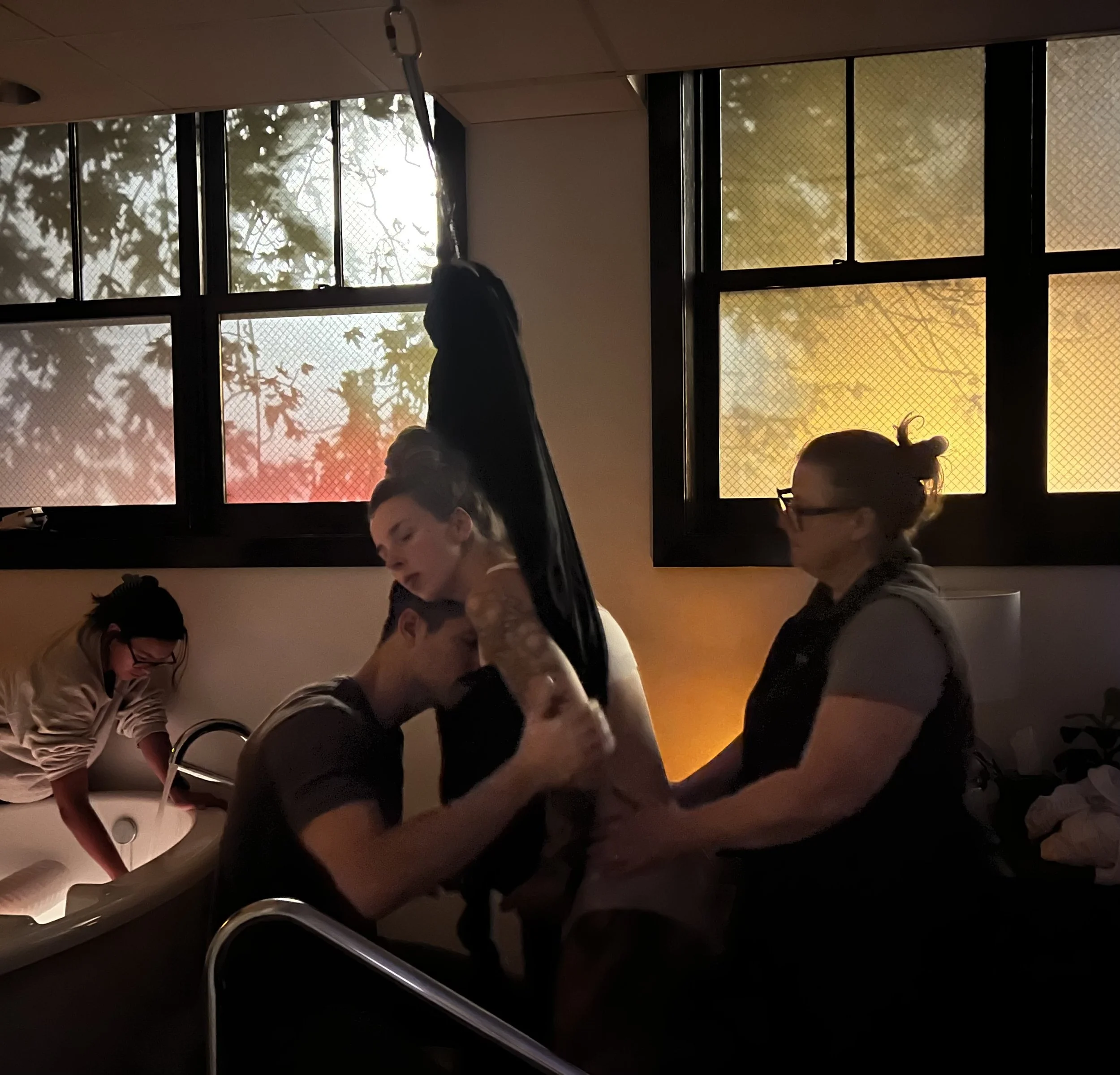 Doula Victoria offering comfort massage and physical support while BCC client uses silks to rest in-between contractions.